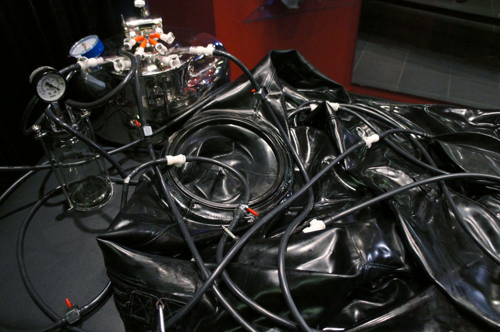 Hier erlebst Du ein unschlagbar nasses Gummi-Sauggefühl am ganzen Körper. Durch die vielen Absaugschläuche ist ein komplett luftbefreiter Latexgenuss garantiert, dieser kann durch Pulsationen noch gesteigert werden. Selbstverständlich kann das pulsieren in seiner Geschwindigkeit variieren, ganz nach Deinem Feeling. So erlebst Du ein Hightech-Latex-Bondage der Superlative.